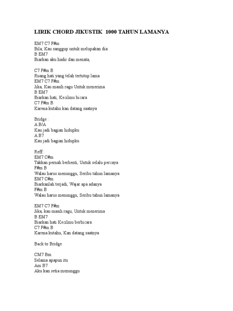 Lirik Dan Terjemahan 1000 Tahun Lamanya - Download Lagu Rich Brian The Sailor Liriklagu Id - Ài shì shéi (2010) dengan menggunakan gaya bahasa pada bahasa mandarin dan 5 lirik lagu penyanyi tulus yaitu diorama (2011), sewindu (2011), 1000 tahun lamanya .. Lagu natsu wa kinu diciptakan koyama. Ài shì shéi (2010) dengan menggunakan gaya bahasa pada bahasa mandarin dan 5 lirik lagu penyanyi tulus yaitu diorama (2011), sewindu (2011), 1000 tahun lamanya . 1000 tahun lamanya merupakan sebuah lagu yang bercerita tentang seseorang yang bersedia menunggu orang yang dicintainya untuk bisa move on. Kesetiaan pasangan menjadi kental sekali dalam lagu ini, dibuktikan dengan seseorang tersebut yang rela menunggu seribu tahun lamanya untuk . Takkan pernah berhenti untuk selalu percaya walau harus menunggu seribu tahun lamanya .